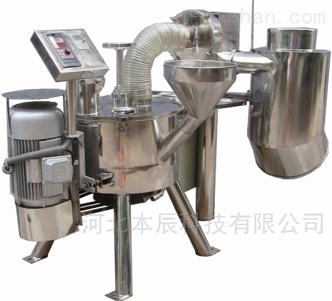 研磨式中藥超微粉碎機工作原理和傳統中醫研船,腳踏碾輪粉碎原理相同。碾輪在軌道上圓周滾動(dòng),加上適當壓力,在反復碾軋的過(guò)程中使物料粉碎并達到需要的細度。由于碾輪雙邊刃口有剪切作用,也協(xié)同粉碎,特別是纖維性物料。粉碎過(guò)程中細的物料飄浮起來(lái)被風(fēng)機吸入,排到旋風(fēng)集料罐,布袋排出氣體,成品料粉留在袋內。